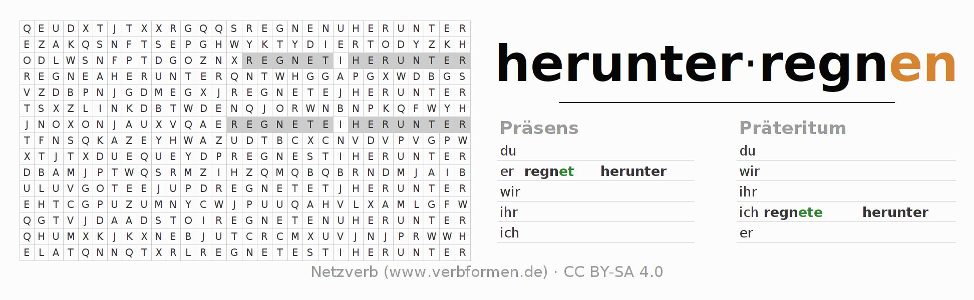 Anleitung: Verbformen des Verbs herunterregnen bilden und im Rätsel wiederfinden oder gebeugte Form von herunterregnen im Buchstabensalat erkennen und der richtigen Verbform zuordnen. Umlaute und ß sind als oe, ae und ue sowie ss umschrieben. Die Lösung befindet sich am Ende der Seite.