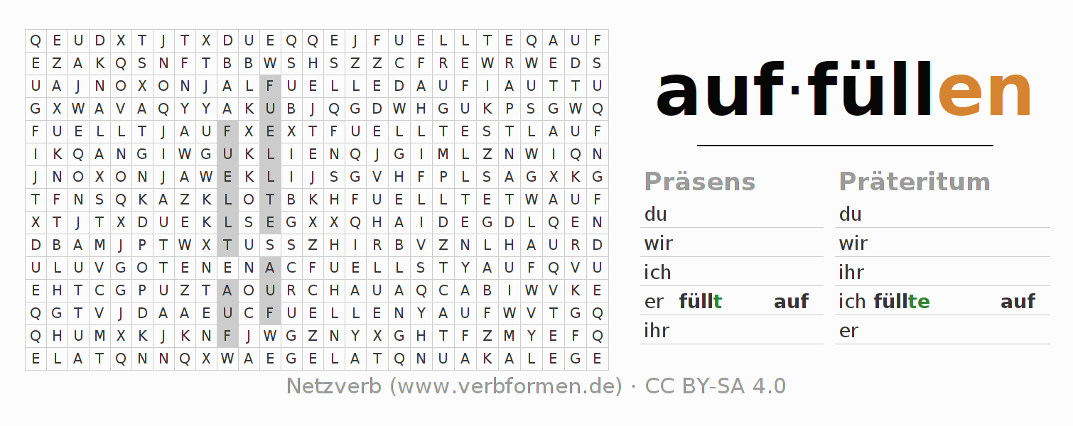 Anleitung: Verbformen des Verbs auffüllen bilden und im Rätsel wiederfinden oder gebeugte Form von auffüllen im Buchstabensalat erkennen und der richtigen Verbform zuordnen. Umlaute und ß sind als oe, ae und ue sowie ss umschrieben. Die Lösung befindet sich am Ende der Seite.