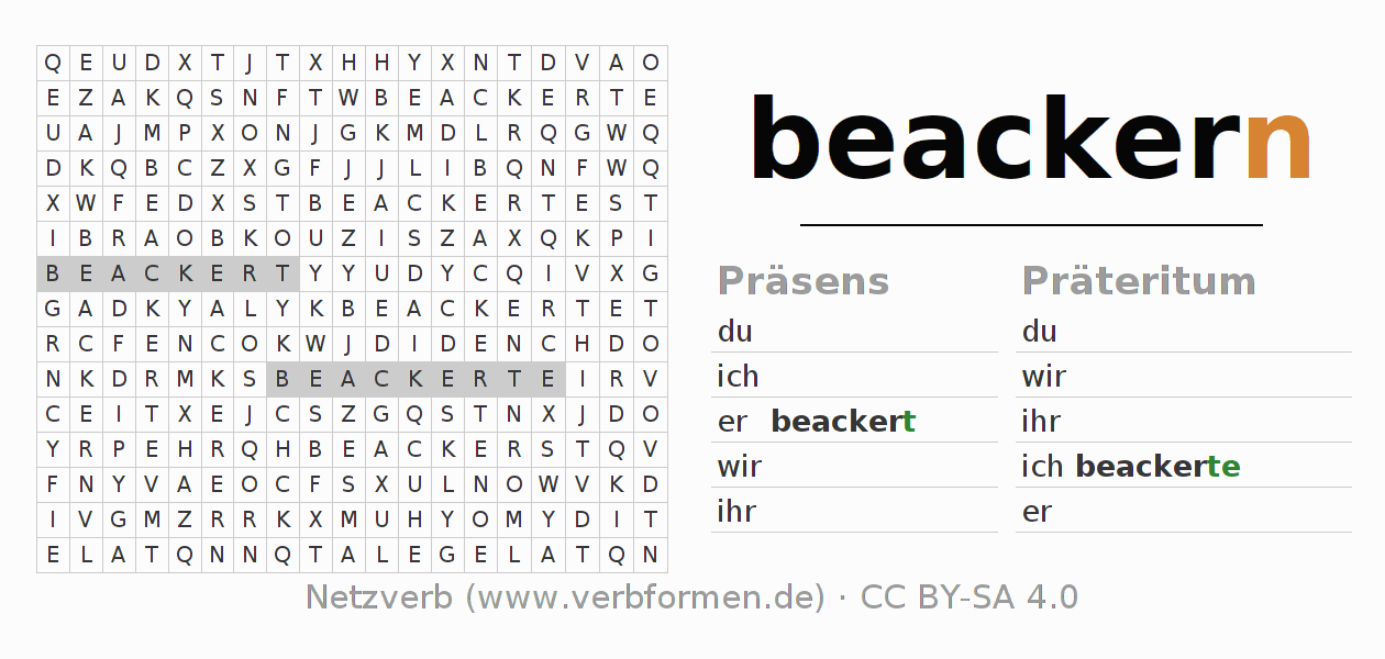 Anleitung: Verbformen des Verbs beackern bilden und im Rätsel wiederfinden oder gebeugte Form von beackern im Buchstabensalat erkennen und der richtigen Verbform zuordnen. Umlaute und ß sind als oe, ae und ue sowie ss umschrieben. Die Lösung befindet sich am Ende der Seite.