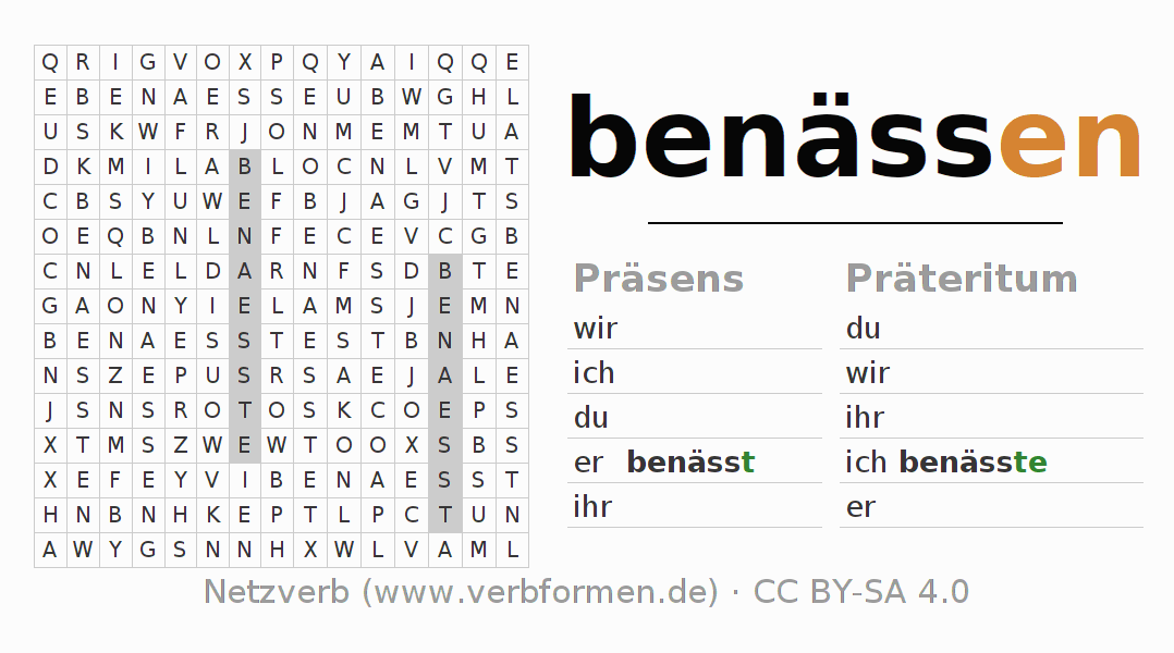 Anleitung: Verbformen des Verbs benässen bilden und im Rätsel wiederfinden oder gebeugte Form von benässen im Buchstabensalat erkennen und der richtigen Verbform zuordnen. Umlaute und ß sind als oe, ae und ue sowie ss umschrieben. Die Lösung befindet sich am Ende der Seite.