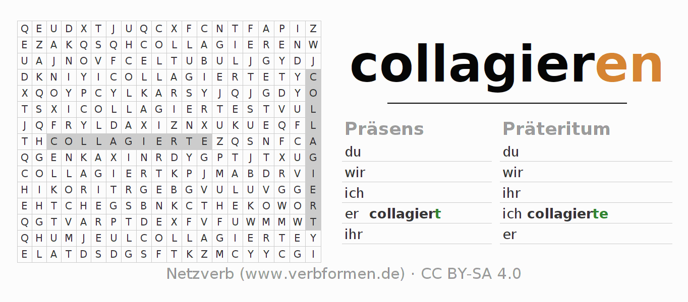 Anleitung: Verbformen des Verbs collagieren bilden und im Rätsel wiederfinden oder gebeugte Form von collagieren im Buchstabensalat erkennen und der richtigen Verbform zuordnen. Umlaute und ß sind als oe, ae und ue sowie ss umschrieben. Die Lösung befindet sich am Ende der Seite.