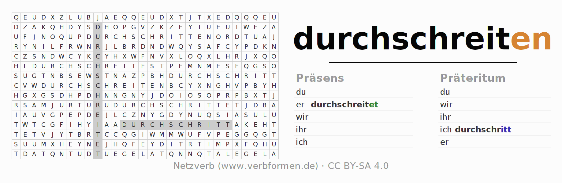 Anleitung: Verbformen des Verbs durchschreiten bilden und im Rätsel wiederfinden oder gebeugte Form von durchschreiten im Buchstabensalat erkennen und der richtigen Verbform zuordnen. Umlaute und ß sind als oe, ae und ue sowie ss umschrieben. Die Lösung befindet sich am Ende der Seite.