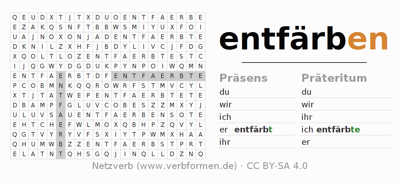 Anleitung: Verbformen des Verbs entfärben bilden und im Rätsel wiederfinden oder gebeugte Form von entfärben im Buchstabensalat erkennen und der richtigen Verbform zuordnen. Umlaute und ß sind als oe, ae und ue sowie ss umschrieben. Die Lösung befindet sich am Ende der Seite.