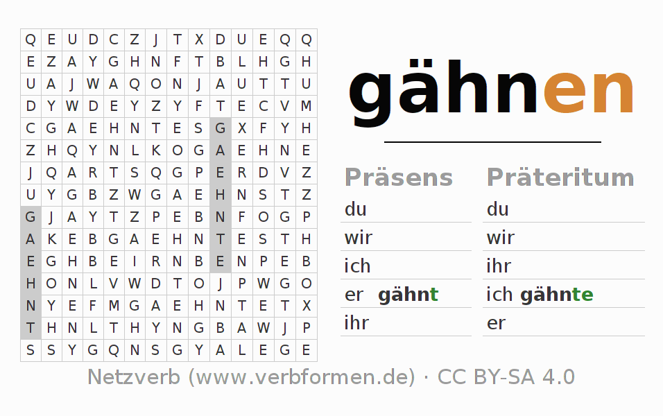 Anleitung: Verbformen des Verbs gähnen bilden und im Rätsel wiederfinden oder gebeugte Form von gähnen im Buchstabensalat erkennen und der richtigen Verbform zuordnen. Umlaute und ß sind als oe, ae und ue sowie ss umschrieben. Die Lösung befindet sich am Ende der Seite.