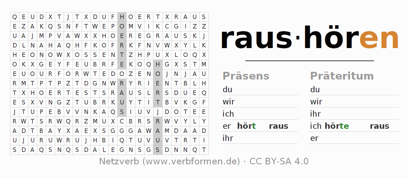 Anleitung: Verbformen des Verbs raushören bilden und im Rätsel wiederfinden oder gebeugte Form von raushören im Buchstabensalat erkennen und der richtigen Verbform zuordnen. Umlaute und ß sind als oe, ae und ue sowie ss umschrieben. Die Lösung befindet sich am Ende der Seite.