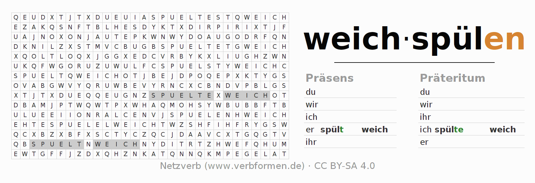 Anleitung: Verbformen des Verbs weichspülen bilden und im Rätsel wiederfinden oder gebeugte Form von weichspülen im Buchstabensalat erkennen und der richtigen Verbform zuordnen. Umlaute und ß sind als oe, ae und ue sowie ss umschrieben. Die Lösung befindet sich am Ende der Seite.