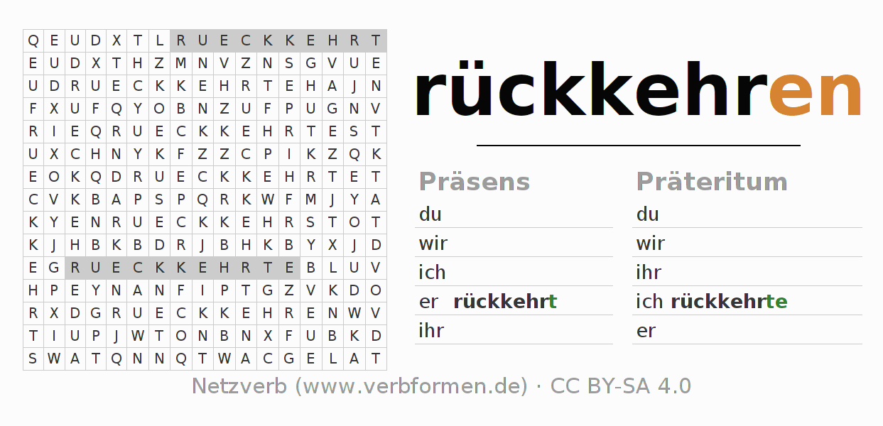 Anleitung: Verbformen des Verbs rückkehren bilden und im Rätsel wiederfinden oder gebeugte Form von rückkehren im Buchstabensalat erkennen und der richtigen Verbform zuordnen. Umlaute und ß sind als oe, ae und ue sowie ss umschrieben. Die Lösung befindet sich am Ende der Seite.