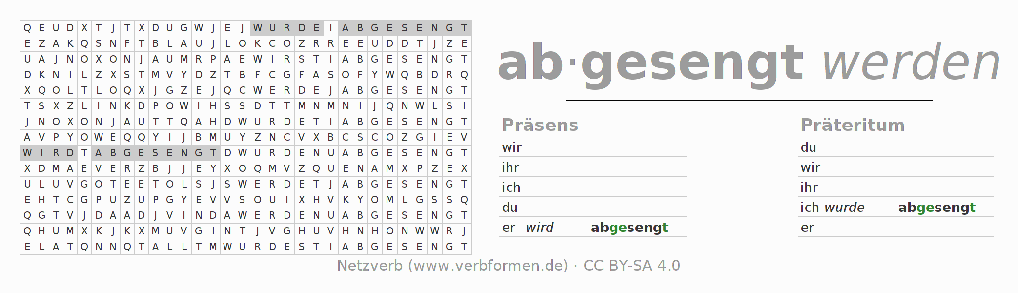 Anleitung: Verbformen des Verbs absengen bilden und im Rätsel wiederfinden oder gebeugte Form von absengen im Buchstabensalat erkennen und der richtigen Verbform zuordnen. Umlaute und ß sind als oe, ae und ue sowie ss umschrieben. Die Lösung befindet sich am Ende der Seite.