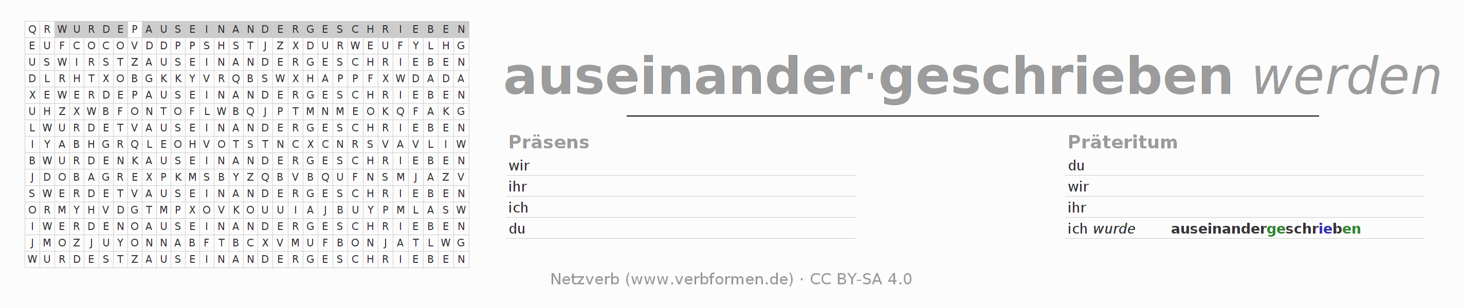 Anleitung: Verbformen des Verbs auseinanderschreiben bilden und im Rätsel wiederfinden oder gebeugte Form von auseinanderschreiben im Buchstabensalat erkennen und der richtigen Verbform zuordnen. Umlaute und ß sind als oe, ae und ue sowie ss umschrieben. Die Lösung befindet sich am Ende der Seite.