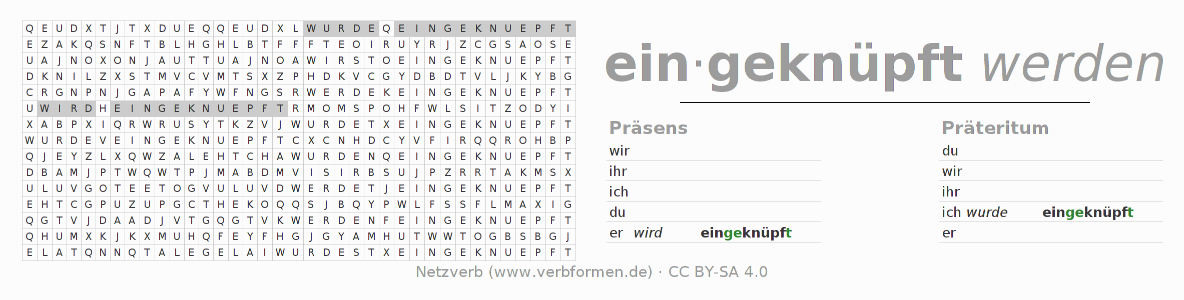 Wortsuchrätsel für die Konjugation des Verbs einknüpfen 〈Vorgangspassiv〉