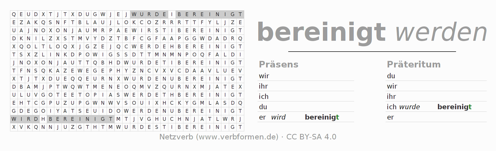 Anleitung: Verbformen des Verbs bereinigen bilden und im Rätsel wiederfinden oder gebeugte Form von bereinigen im Buchstabensalat erkennen und der richtigen Verbform zuordnen. Umlaute und ß sind als oe, ae und ue sowie ss umschrieben. Die Lösung befindet sich am Ende der Seite.