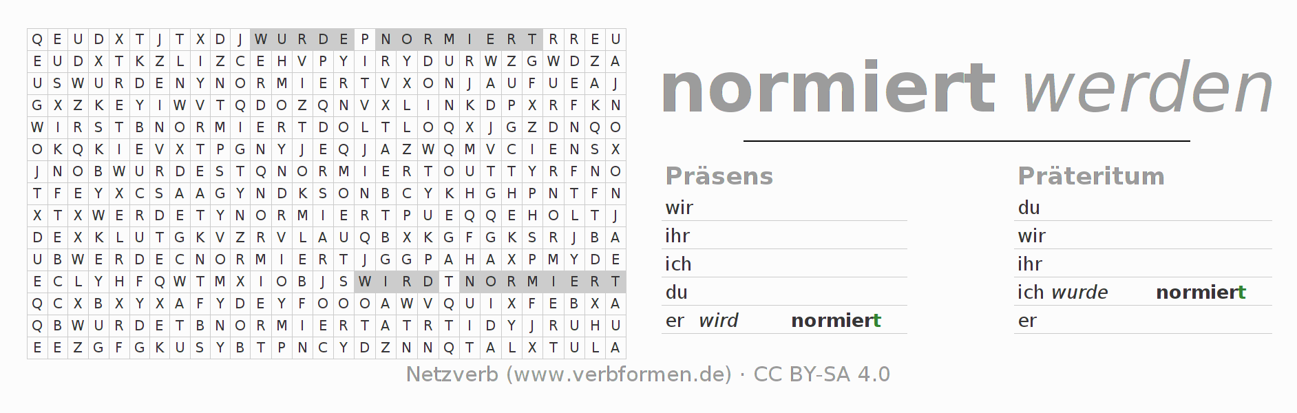 Anleitung: Verbformen des Verbs normieren bilden und im Rätsel wiederfinden oder gebeugte Form von normieren im Buchstabensalat erkennen und der richtigen Verbform zuordnen. Umlaute und ß sind als oe, ae und ue sowie ss umschrieben. Die Lösung befindet sich am Ende der Seite.