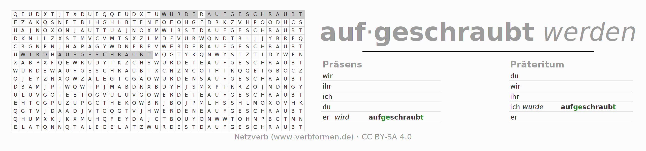 Anleitung: Verbformen des Verbs aufschrauben bilden und im Rätsel wiederfinden oder gebeugte Form von aufschrauben im Buchstabensalat erkennen und der richtigen Verbform zuordnen. Umlaute und ß sind als oe, ae und ue sowie ss umschrieben. Die Lösung befindet sich am Ende der Seite.