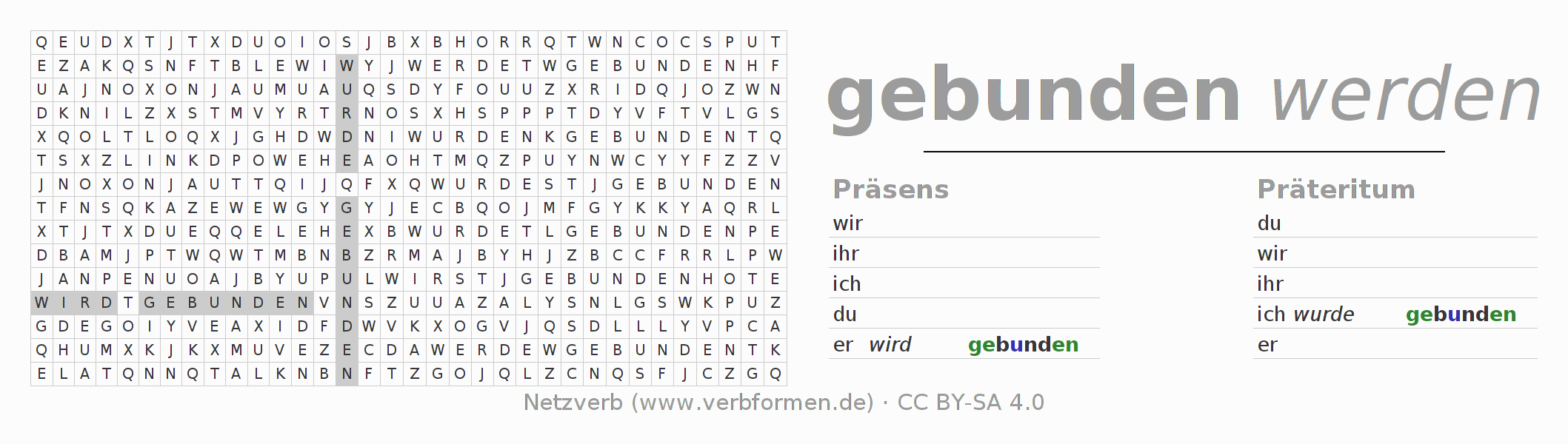 Anleitung: Verbformen des Verbs binden bilden und im Rätsel wiederfinden oder gebeugte Form von binden im Buchstabensalat erkennen und der richtigen Verbform zuordnen. Umlaute und ß sind als oe, ae und ue sowie ss umschrieben. Die Lösung befindet sich am Ende der Seite.