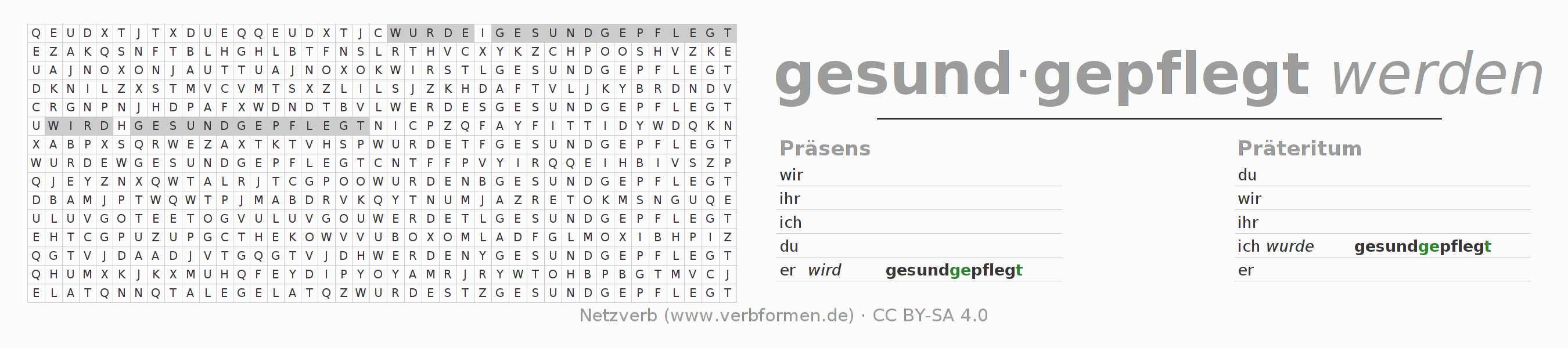 Anleitung: Verbformen des Verbs gesundpflegen bilden und im Rätsel wiederfinden oder gebeugte Form von gesundpflegen im Buchstabensalat erkennen und der richtigen Verbform zuordnen. Umlaute und ß sind als oe, ae und ue sowie ss umschrieben. Die Lösung befindet sich am Ende der Seite.