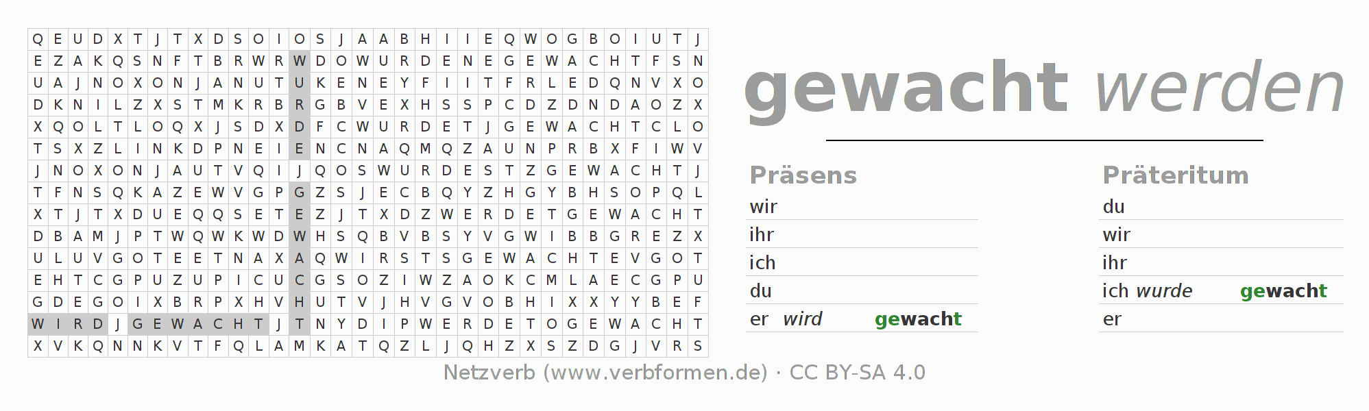 Anleitung: Verbformen des Verbs wachen bilden und im Rätsel wiederfinden oder gebeugte Form von wachen im Buchstabensalat erkennen und der richtigen Verbform zuordnen. Umlaute und ß sind als oe, ae und ue sowie ss umschrieben. Die Lösung befindet sich am Ende der Seite.