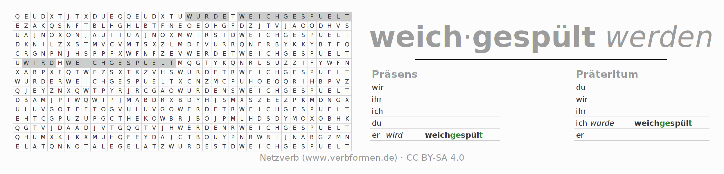 Anleitung: Verbformen des Verbs weichspülen bilden und im Rätsel wiederfinden oder gebeugte Form von weichspülen im Buchstabensalat erkennen und der richtigen Verbform zuordnen. Umlaute und ß sind als oe, ae und ue sowie ss umschrieben. Die Lösung befindet sich am Ende der Seite.