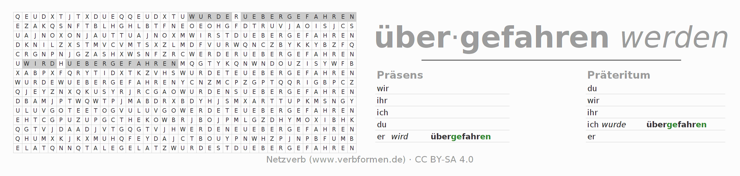 Anleitung: Verbformen des Verbs überfahren bilden und im Rätsel wiederfinden oder gebeugte Form von überfahren im Buchstabensalat erkennen und der richtigen Verbform zuordnen. Umlaute und ß sind als oe, ae und ue sowie ss umschrieben. Die Lösung befindet sich am Ende der Seite.
