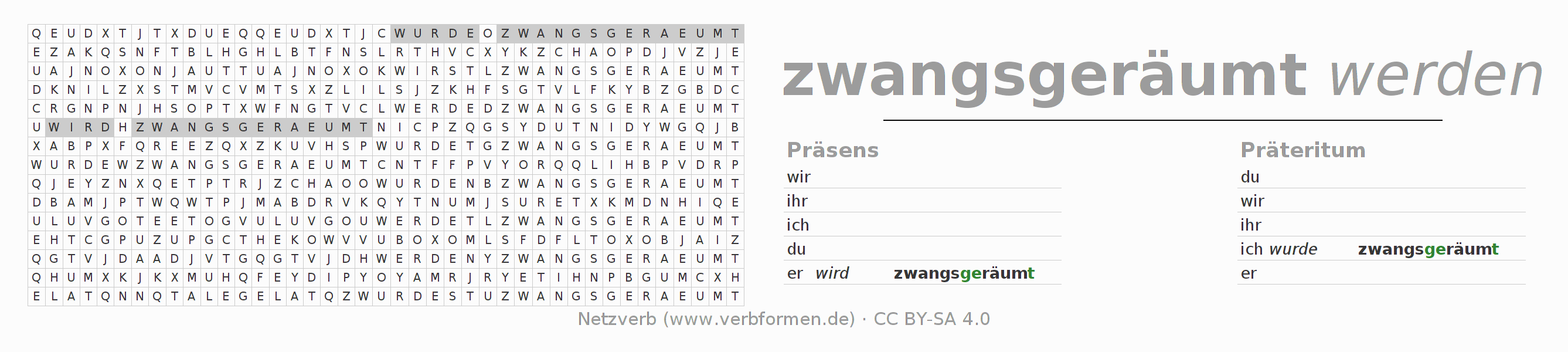 Anleitung: Verbformen des Verbs zwangsräumen bilden und im Rätsel wiederfinden oder gebeugte Form von zwangsräumen im Buchstabensalat erkennen und der richtigen Verbform zuordnen. Umlaute und ß sind als oe, ae und ue sowie ss umschrieben. Die Lösung befindet sich am Ende der Seite.