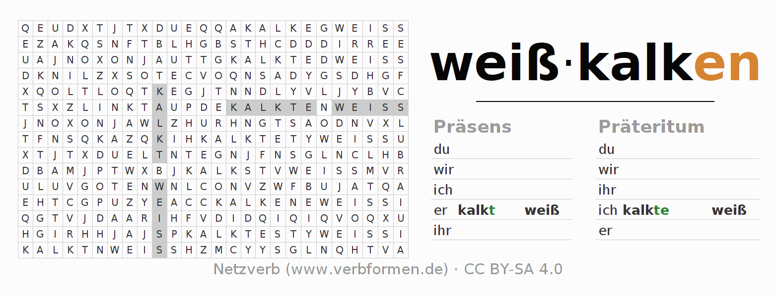 Anleitung: Verbformen des Verbs weißkalken bilden und im Rätsel wiederfinden oder gebeugte Form von weißkalken im Buchstabensalat erkennen und der richtigen Verbform zuordnen. Umlaute und ß sind als oe, ae und ue sowie ss umschrieben. Die Lösung befindet sich am Ende der Seite.
