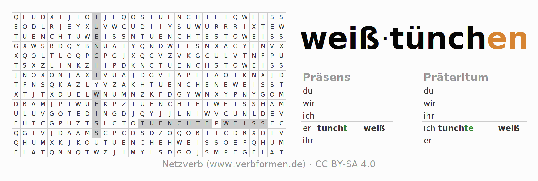 Anleitung: Verbformen des Verbs weißtünchen bilden und im Rätsel wiederfinden oder gebeugte Form von weißtünchen im Buchstabensalat erkennen und der richtigen Verbform zuordnen. Umlaute und ß sind als oe, ae und ue sowie ss umschrieben. Die Lösung befindet sich am Ende der Seite.