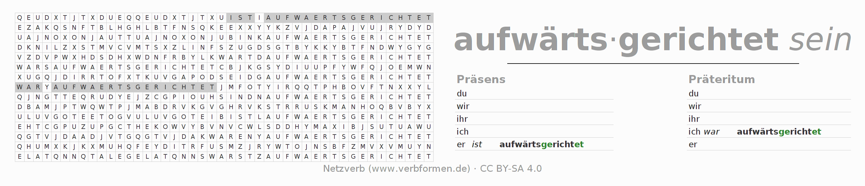 Anleitung: Verbformen des Verbs aufwärtsrichten bilden und im Rätsel wiederfinden oder gebeugte Form von aufwärtsrichten im Buchstabensalat erkennen und der richtigen Verbform zuordnen. Umlaute und ß sind als oe, ae und ue sowie ss umschrieben. Die Lösung befindet sich am Ende der Seite.