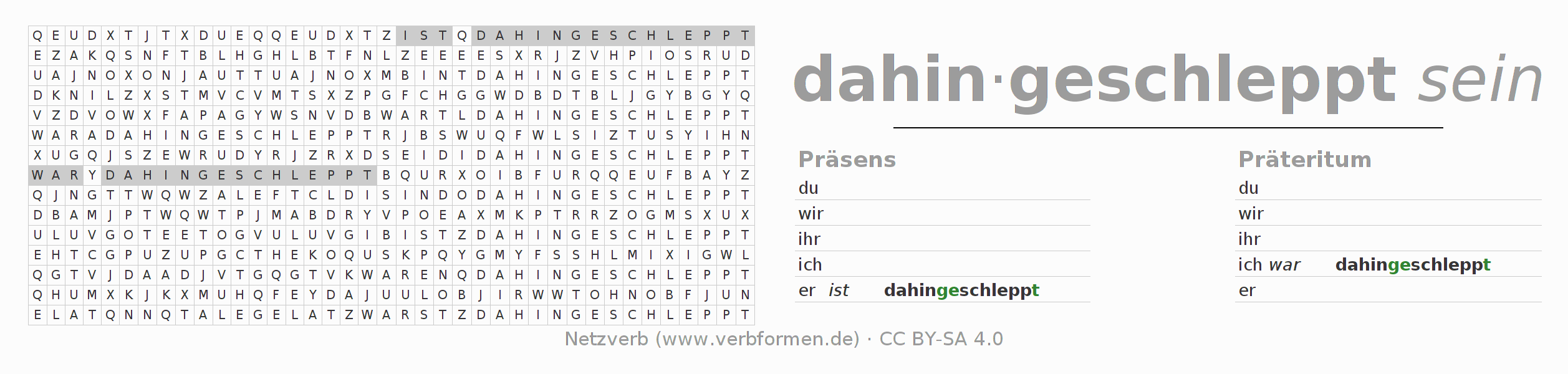 Anleitung: Verbformen des Verbs dahinschleppen bilden und im Rätsel wiederfinden oder gebeugte Form von dahinschleppen im Buchstabensalat erkennen und der richtigen Verbform zuordnen. Umlaute und ß sind als oe, ae und ue sowie ss umschrieben. Die Lösung befindet sich am Ende der Seite.