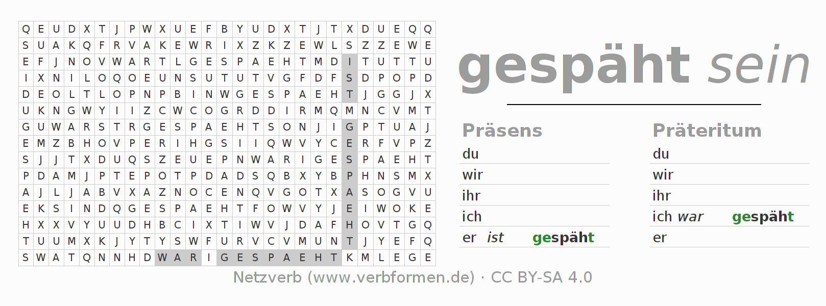 Anleitung: Verbformen des Verbs spähen bilden und im Rätsel wiederfinden oder gebeugte Form von spähen im Buchstabensalat erkennen und der richtigen Verbform zuordnen. Umlaute und ß sind als oe, ae und ue sowie ss umschrieben. Die Lösung befindet sich am Ende der Seite.
