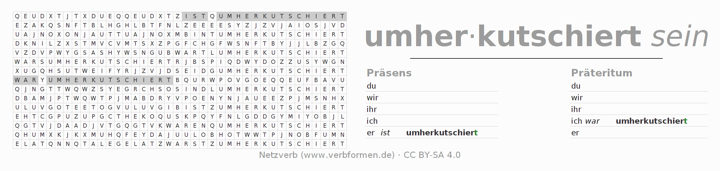 Anleitung: Verbformen des Verbs umherkutschieren bilden und im Rätsel wiederfinden oder gebeugte Form von umherkutschieren im Buchstabensalat erkennen und der richtigen Verbform zuordnen. Umlaute und ß sind als oe, ae und ue sowie ss umschrieben. Die Lösung befindet sich am Ende der Seite.