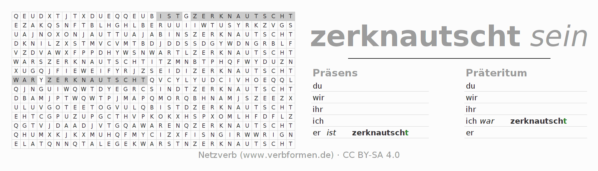 Anleitung: Verbformen des Verbs zerknautschen bilden und im Rätsel wiederfinden oder gebeugte Form von zerknautschen im Buchstabensalat erkennen und der richtigen Verbform zuordnen. Umlaute und ß sind als oe, ae und ue sowie ss umschrieben. Die Lösung befindet sich am Ende der Seite.