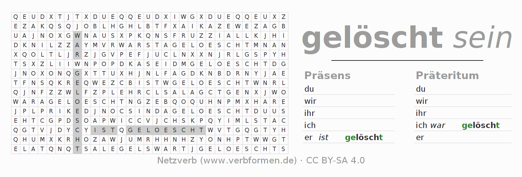 Anleitung: Verbformen des Verbs löschen bilden und im Rätsel wiederfinden oder gebeugte Form von löschen im Buchstabensalat erkennen und der richtigen Verbform zuordnen. Umlaute und ß sind als oe, ae und ue sowie ss umschrieben. Die Lösung befindet sich am Ende der Seite.
