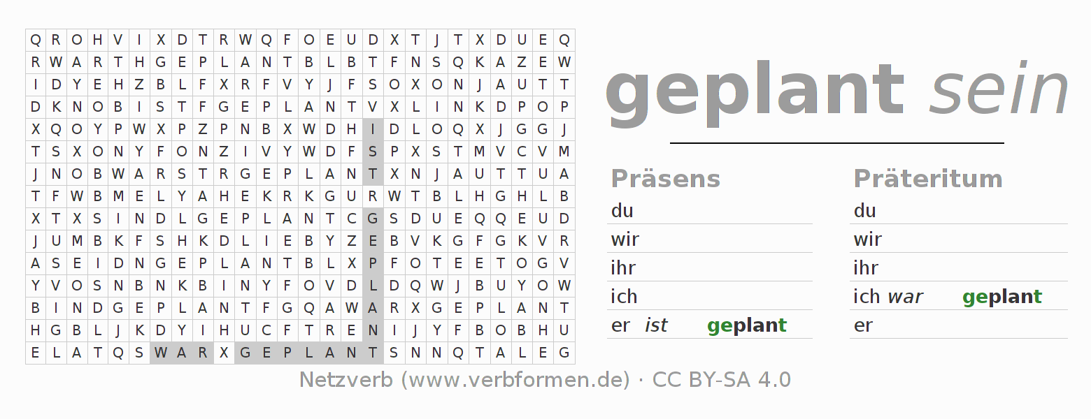 Anleitung: Verbformen des Verbs planen bilden und im Rätsel wiederfinden oder gebeugte Form von planen im Buchstabensalat erkennen und der richtigen Verbform zuordnen. Umlaute und ß sind als oe, ae und ue sowie ss umschrieben. Die Lösung befindet sich am Ende der Seite.