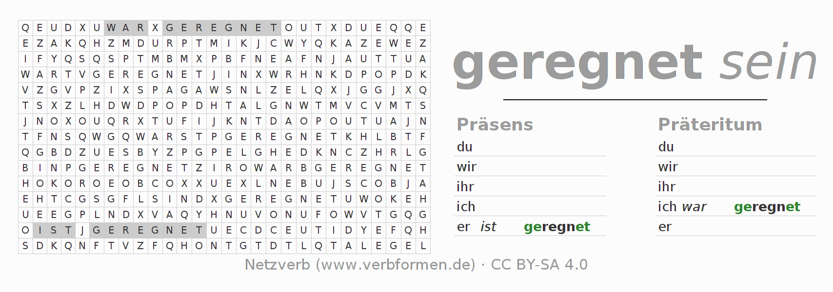 Anleitung: Verbformen des Verbs regnen bilden und im Rätsel wiederfinden oder gebeugte Form von regnen im Buchstabensalat erkennen und der richtigen Verbform zuordnen. Umlaute und ß sind als oe, ae und ue sowie ss umschrieben. Die Lösung befindet sich am Ende der Seite.