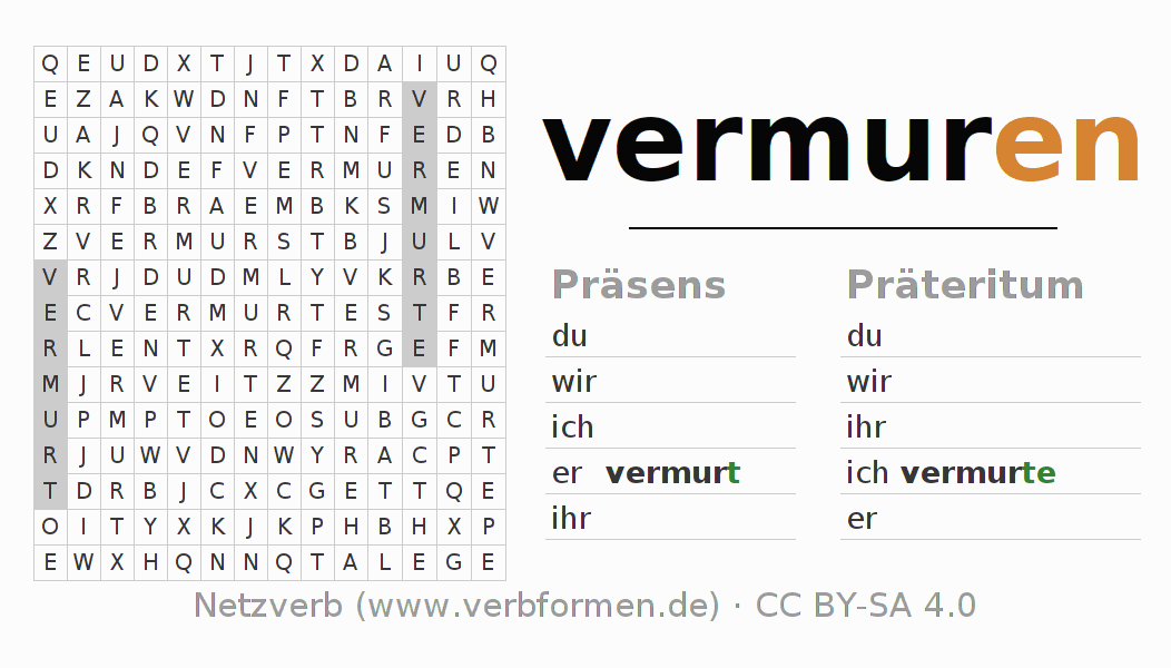 Suchsel, Suchworträtsel für alle Formen des Verbs vermuren