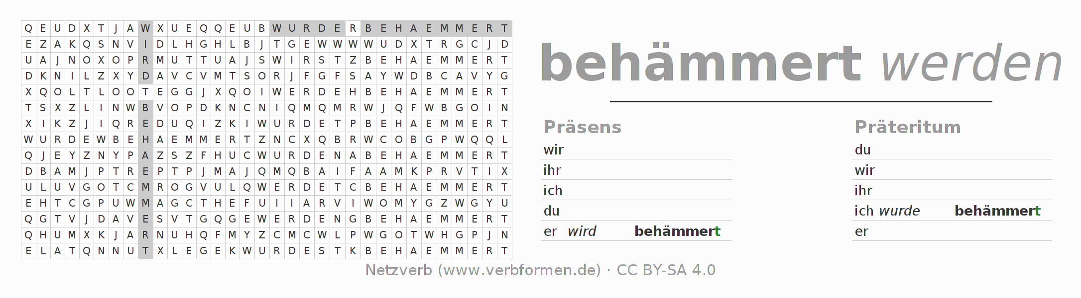 Mit diesen Wortsuchrätseln kann man auf herausfordernde Art und Weise die Konjugation des deutschen Verbs behämmern erlernen.