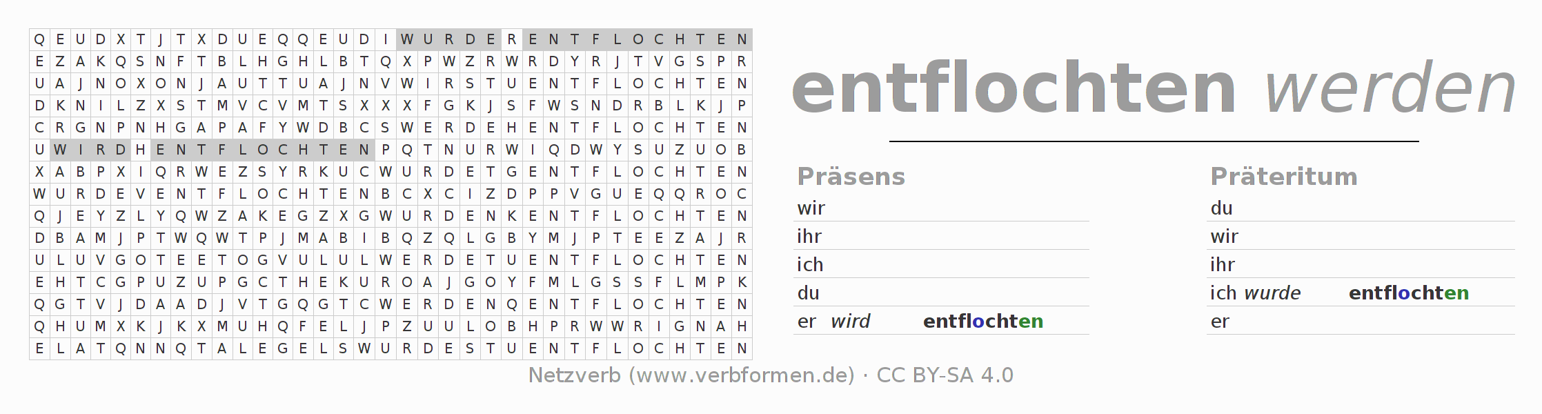 Arbeitsblätter dienen dem Üben der Konjugation des Verbs entflechten im Unterricht und im Selbststudium. Die Materialien können im Rahmen der Lizenz CC BY-SA 4.0 als Open Educational Resources (OER) z. B. im Unterricht kostenlos genutzt werden. Dafür stehen viele verschiedene Typen von Arbeitsblättern für das Verb entflechten (regelm) zur Verfügung. Das sind Konjugationstabellen, Rätsel und Spiele. Das gesamten Unterrichtsmaterial ist als PDF-Download, als Bilder und als interaktive Browser-Version gratis verfügbar. Neben den Aufgaben geben auch unzählige Beispiele für entflechten eine Hilfestellung zur Verwendung des Verbs.
