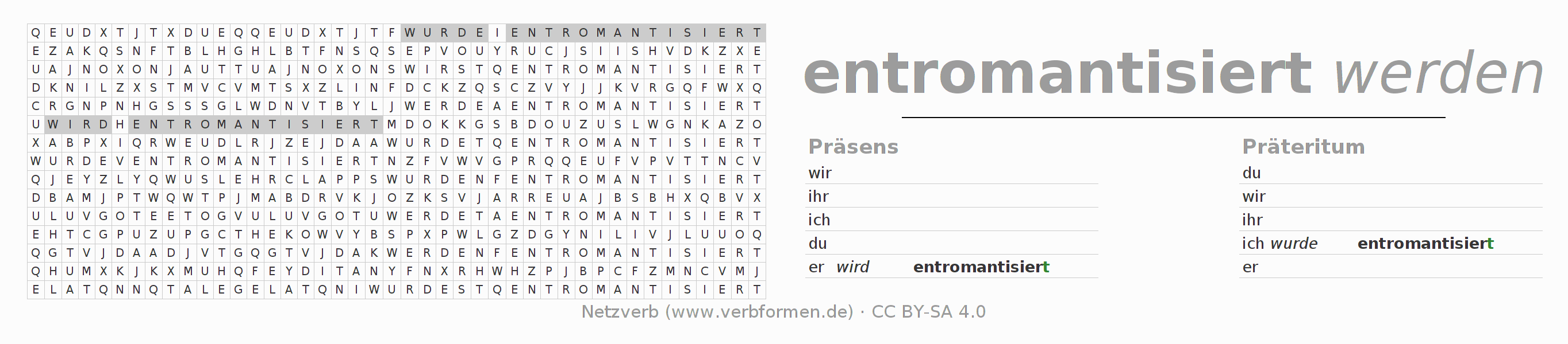 Mit diesen Wortsuchrätseln kann man auf herausfordernde Art und Weise die Konjugation des deutschen Verbs entromantisieren erlernen.