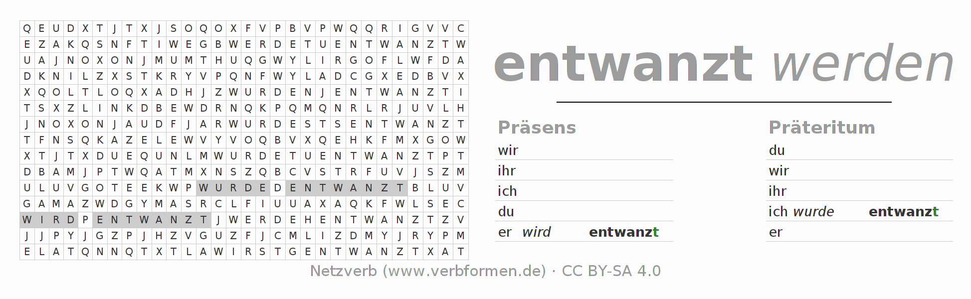 Mit diesen Wortsuchrätseln kann man auf herausfordernde Art und Weise die Konjugation des deutschen Verbs entwanzen erlernen.
