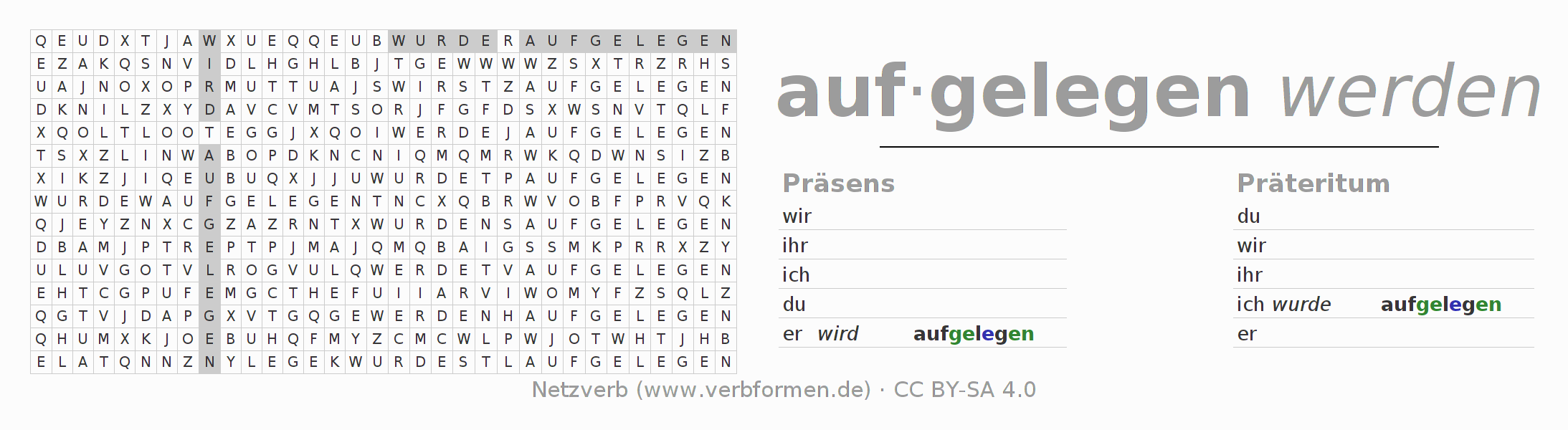 Arbeitsblätter dienen dem Üben der Konjugation des Verbs aufliegen im Unterricht und im Selbststudium. Die Materialien können im Rahmen der Lizenz CC BY-SA 4.0 als Open Educational Resources (OER) z. B. im Unterricht kostenlos genutzt werden. Dafür stehen viele verschiedene Typen von Arbeitsblättern für das Verb aufliegen (hat) zur Verfügung. Das sind Konjugationstabellen, Rätsel und Spiele. Das gesamten Unterrichtsmaterial ist als PDF-Download, als Bilder und als interaktive Browser-Version gratis verfügbar. Neben den Aufgaben geben auch unzählige Beispiele für aufliegen eine Hilfestellung zur Verwendung des Verbs.