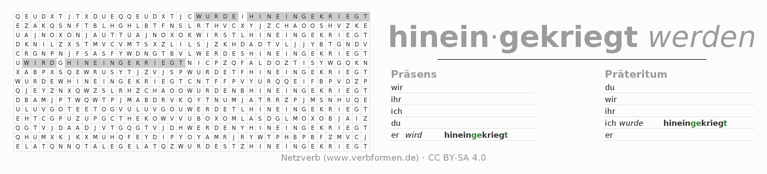 Suchsel, Suchworträtsel für alle Formen des Verbs hineinkriegen