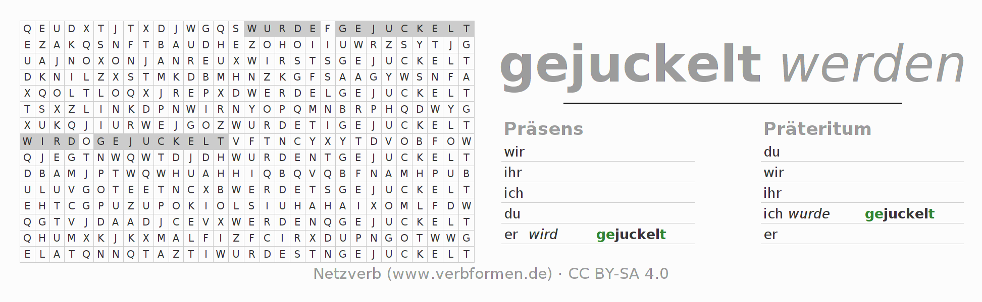 Mit diesen Wortsuchrätseln kann man auf herausfordernde Art und Weise die Konjugation des deutschen Verbs juckeln erlernen.