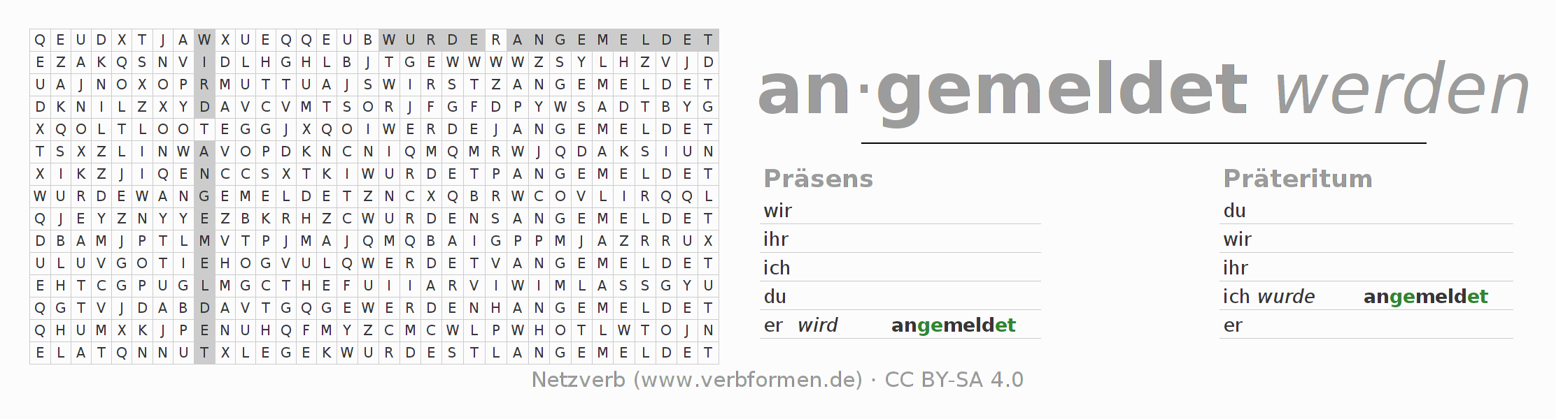 Mit diesen Wortsuchrätseln kann man auf herausfordernde Art und Weise die Konjugation des deutschen Verbs anmelden erlernen.