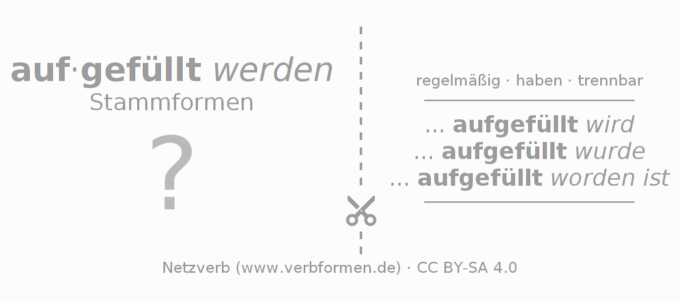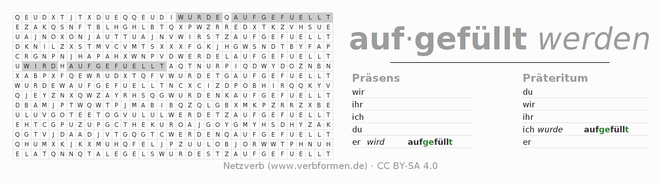 Arbeitsblätter dienen dem Üben der Konjugation des Verbs auffüllen im Unterricht und im Selbststudium. Die Materialien können im Rahmen der Lizenz CC BY-SA 4.0 als Open Educational Resources (OER) z. B. im Unterricht kostenlos genutzt werden. Dafür stehen viele verschiedene Typen von Arbeitsblättern für das Verb auffüllen zur Verfügung. Das sind Konjugationstabellen, Rätsel und Spiele. Das gesamten Unterrichtsmaterial ist als PDF-Download, als Bilder und als interaktive Browser-Version gratis verfügbar. Neben den Aufgaben geben auch unzählige Beispiele für auffüllen eine Hilfestellung zur Verwendung des Verbs.