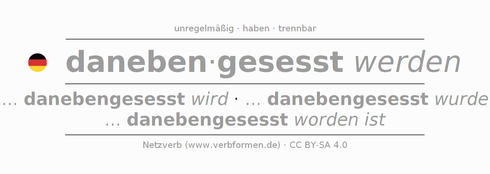 Die Verbtabellen fassen alle Verbformen des Verbs danebensitzen übersichtlich in einer Tabelle zusammen.