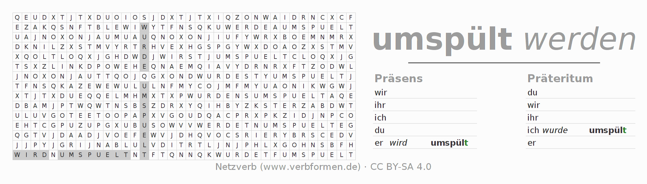 Suchsel, Suchworträtsel für alle Formen des Verbs umspülen