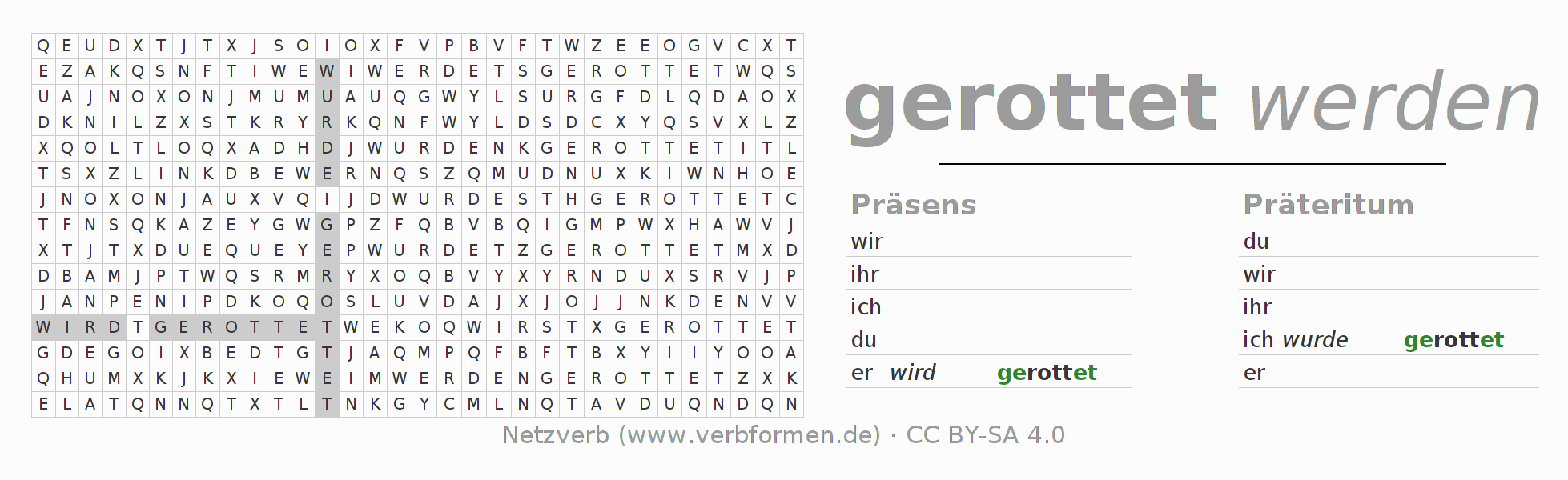 Mit diesen Wortsuchrätseln kann man auf herausfordernde Art und Weise die Konjugation des deutschen Verbs rotten erlernen.