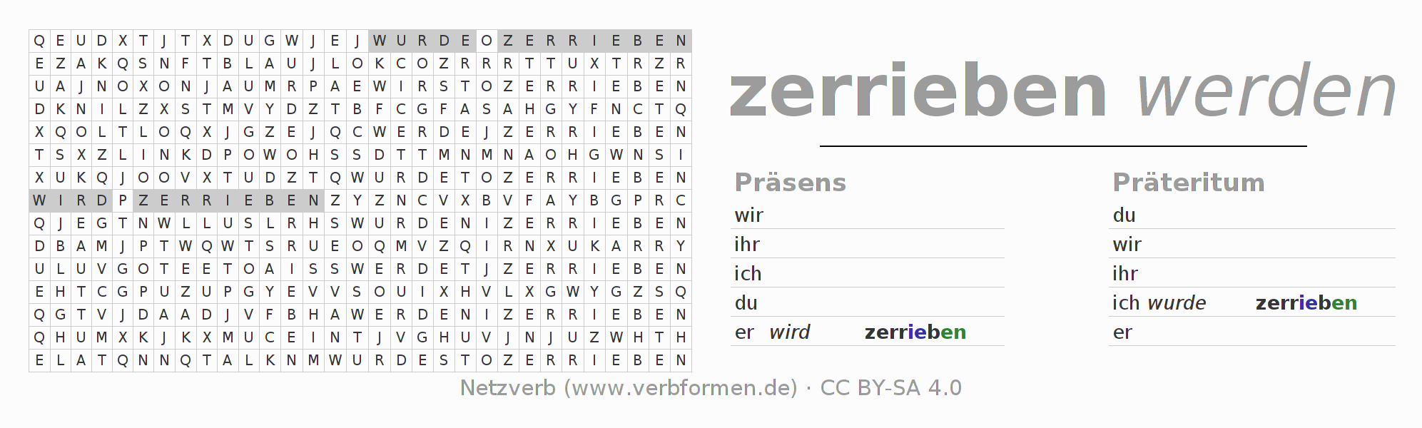 Suchsel, Suchworträtsel für alle Formen des Verbs zerreiben