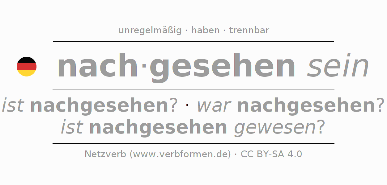 Arbeitsblätter dienen dem Üben der Konjugation des Verbs nachsehen im Unterricht und im Selbststudium. Die Materialien können im Rahmen der Lizenz CC BY-SA 4.0 als Open Educational Resources (OER) z. B. im Unterricht kostenlos genutzt werden. Dafür stehen viele verschiedene Typen von Arbeitsblättern für das Verb nachsehen zur Verfügung. Das sind Konjugationstabellen, Rätsel und Spiele. Das gesamten Unterrichtsmaterial ist als PDF-Download, als Bilder und als interaktive Browser-Version gratis verfügbar. Neben den Aufgaben geben auch unzählige Beispiele für nachsehen eine Hilfestellung zur Verwendung des Verbs.