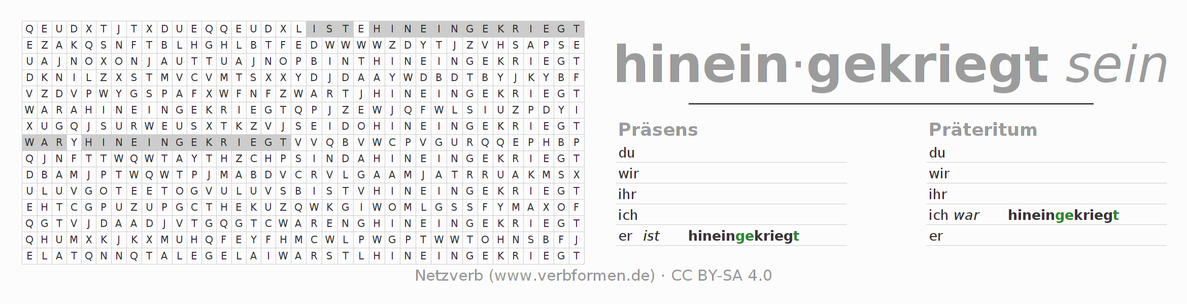 Suchsel, Suchworträtsel für alle Formen des Verbs hineinkriegen