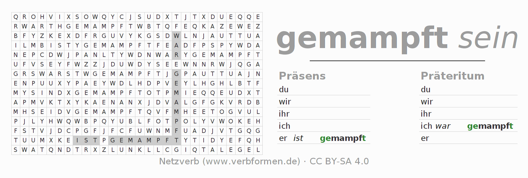 Mit diesen Wortsuchrätseln kann man auf herausfordernde Art und Weise die Konjugation des deutschen Verbs mampfen erlernen.